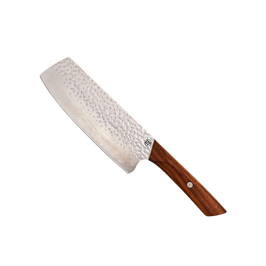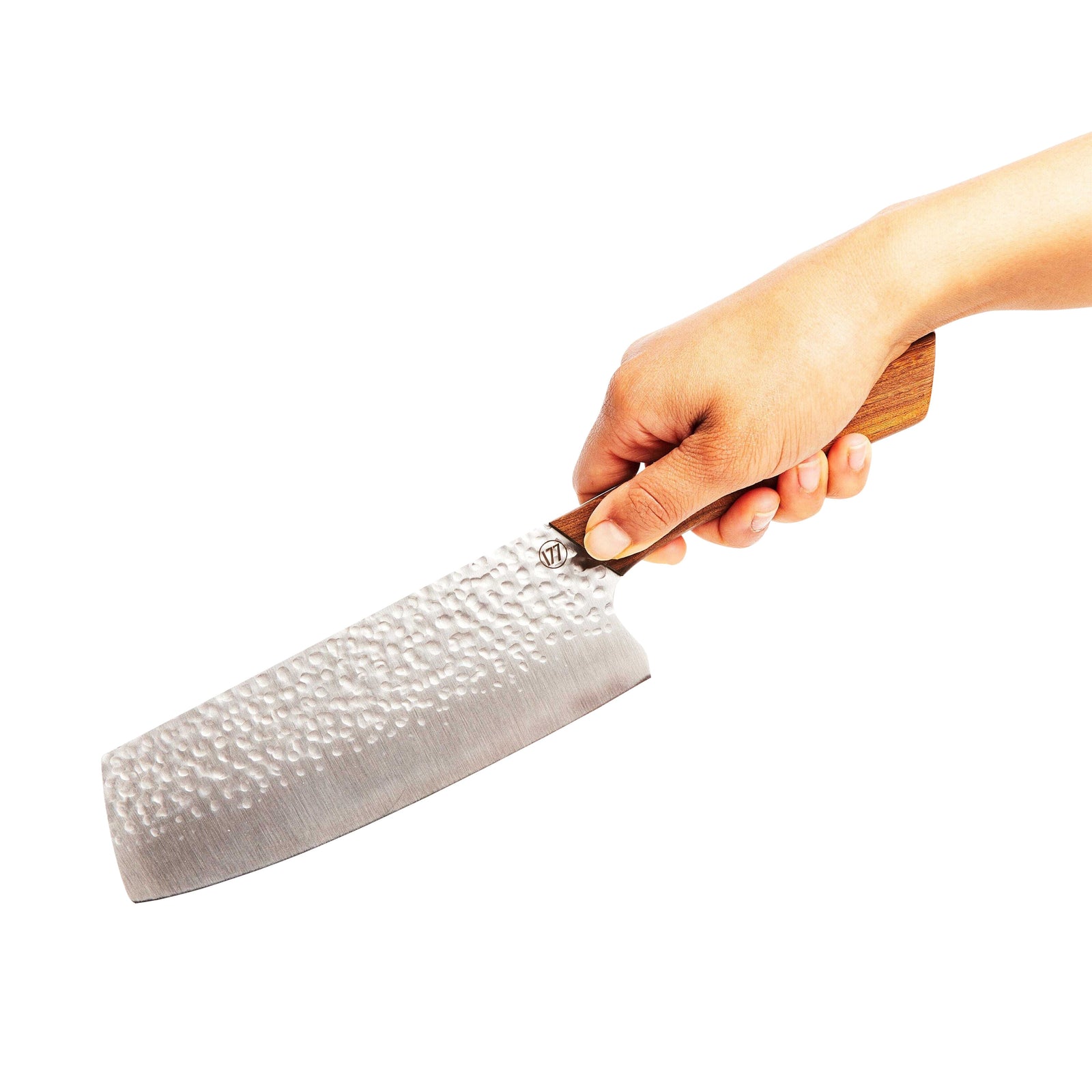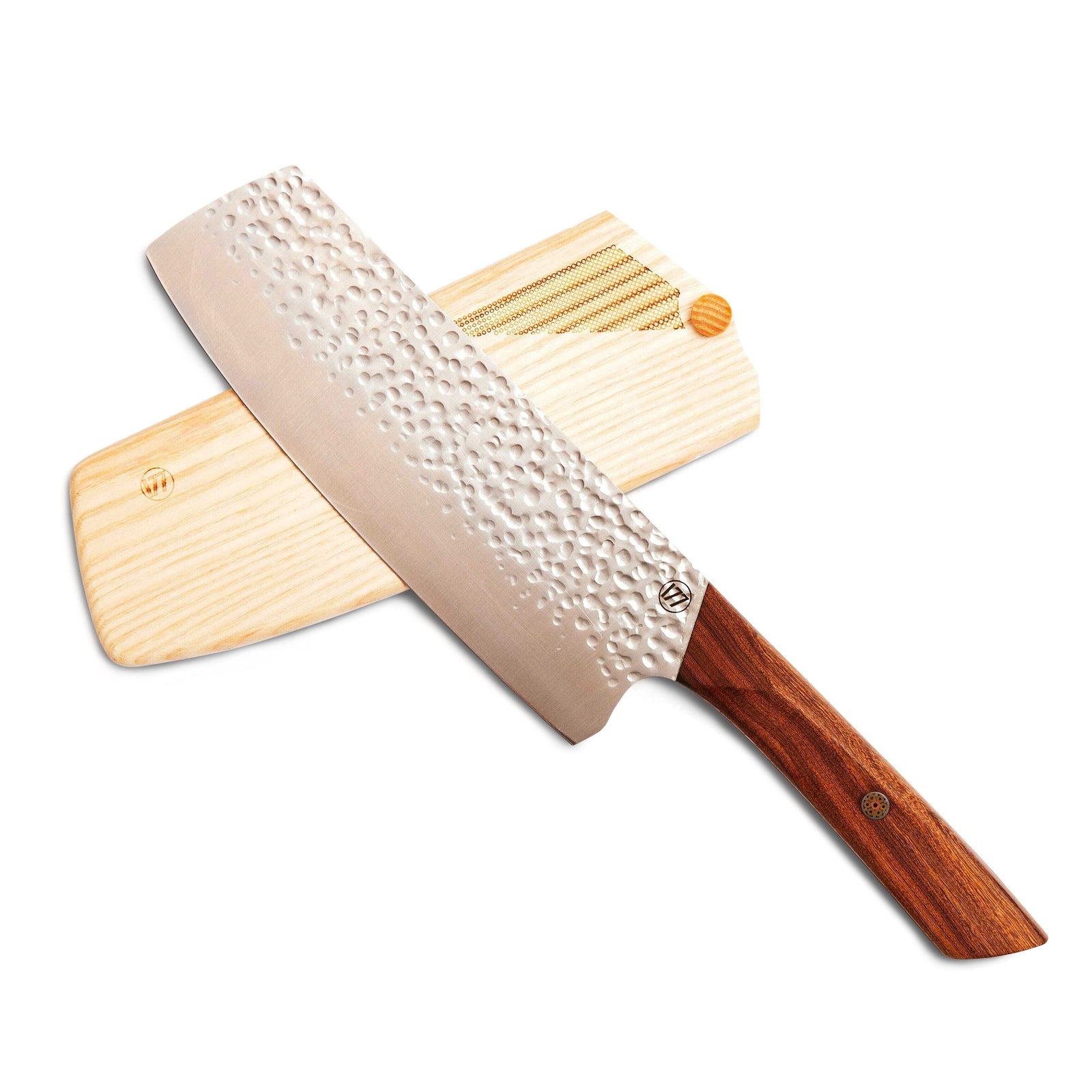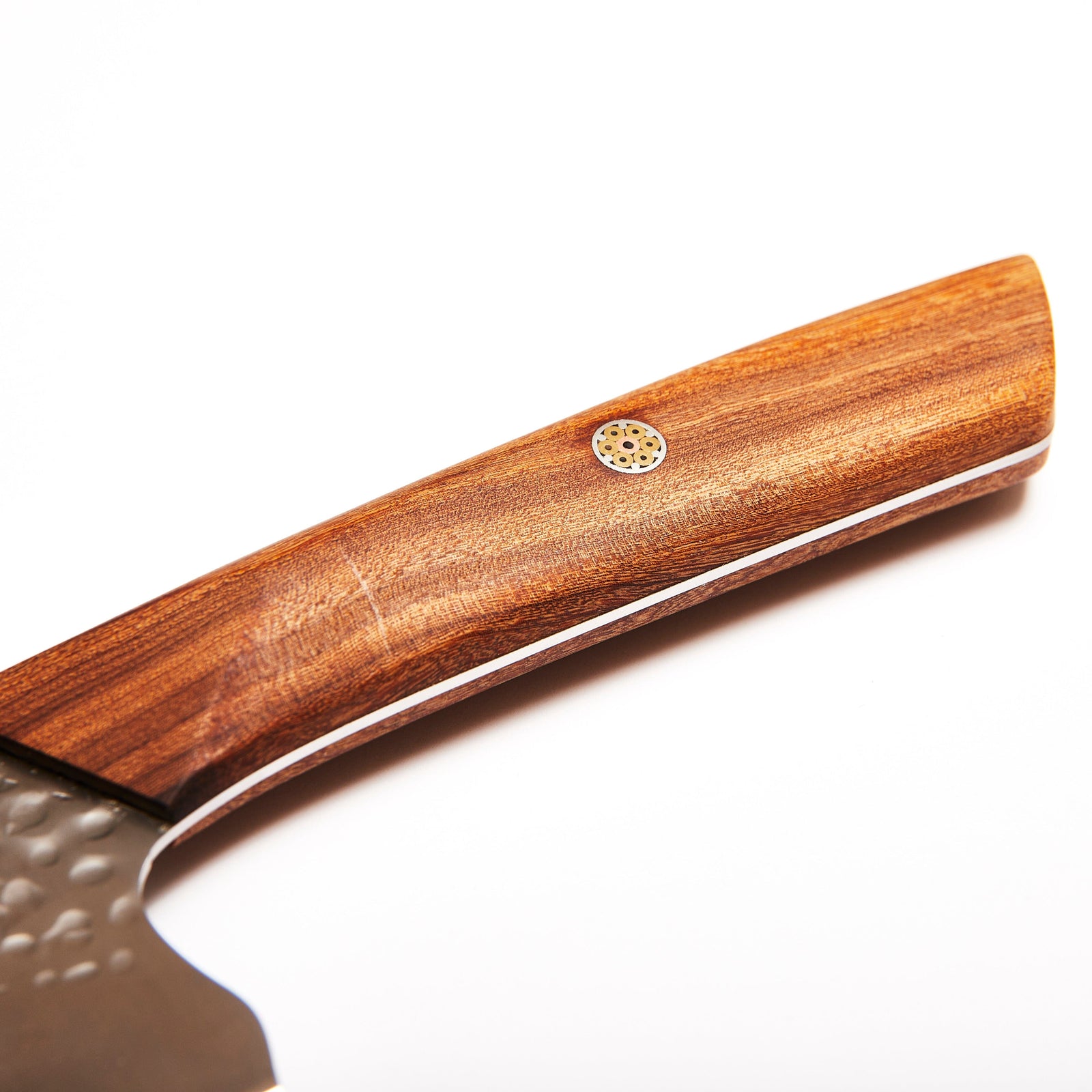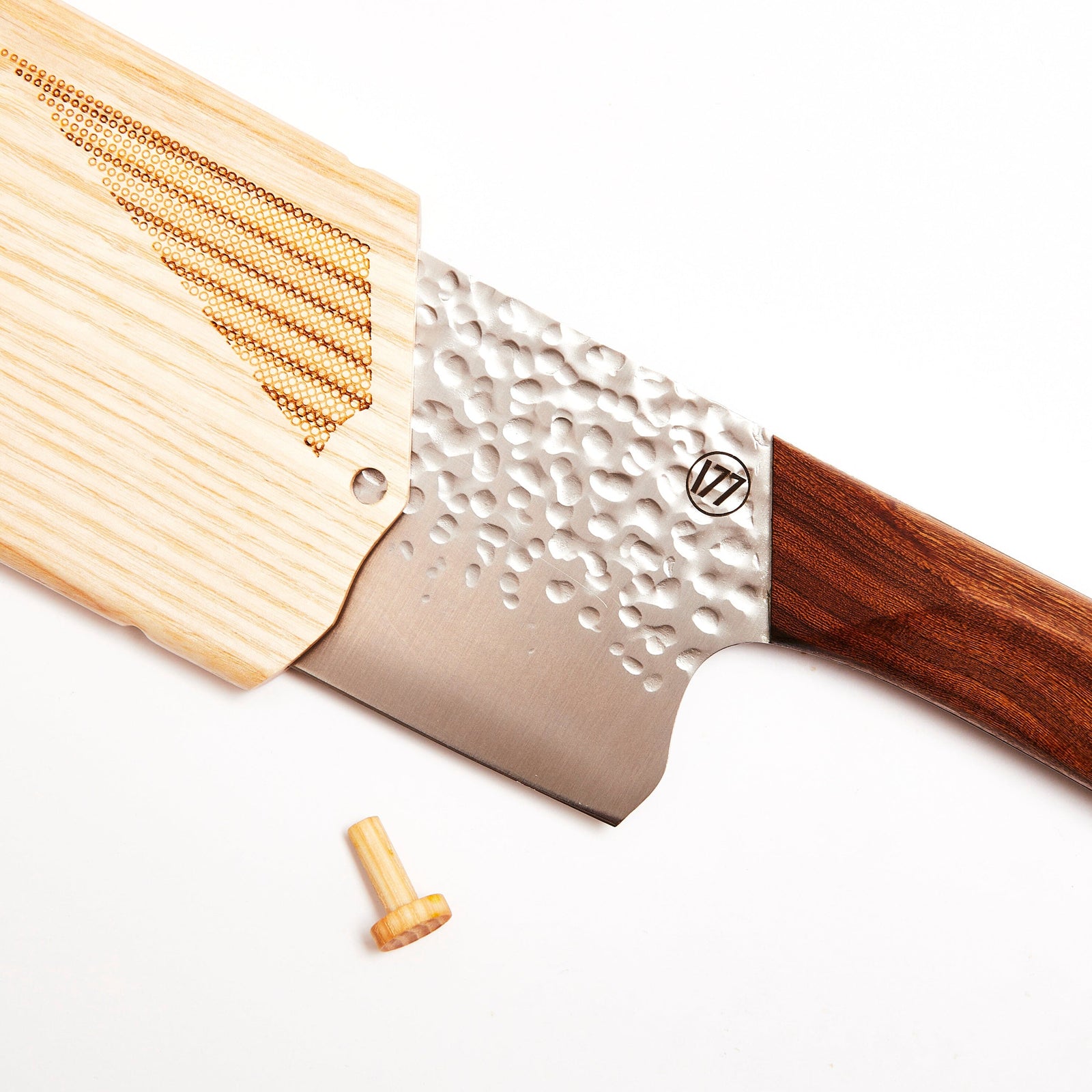 This is a Limited edition, premium run of our tried-and-true Milk Street Kitchin-To knife. It features a high-end Japanese AUS8 steel blade specially treated with a non-stick “Tsuchime” hammered surface and a gorgeously grained cocobolo wood handle. And it comes with a custom saya, or knife guard, to keep your blade keen and protect it in storage. Consider it an heirloom-quality tool to pass on to the next generation.