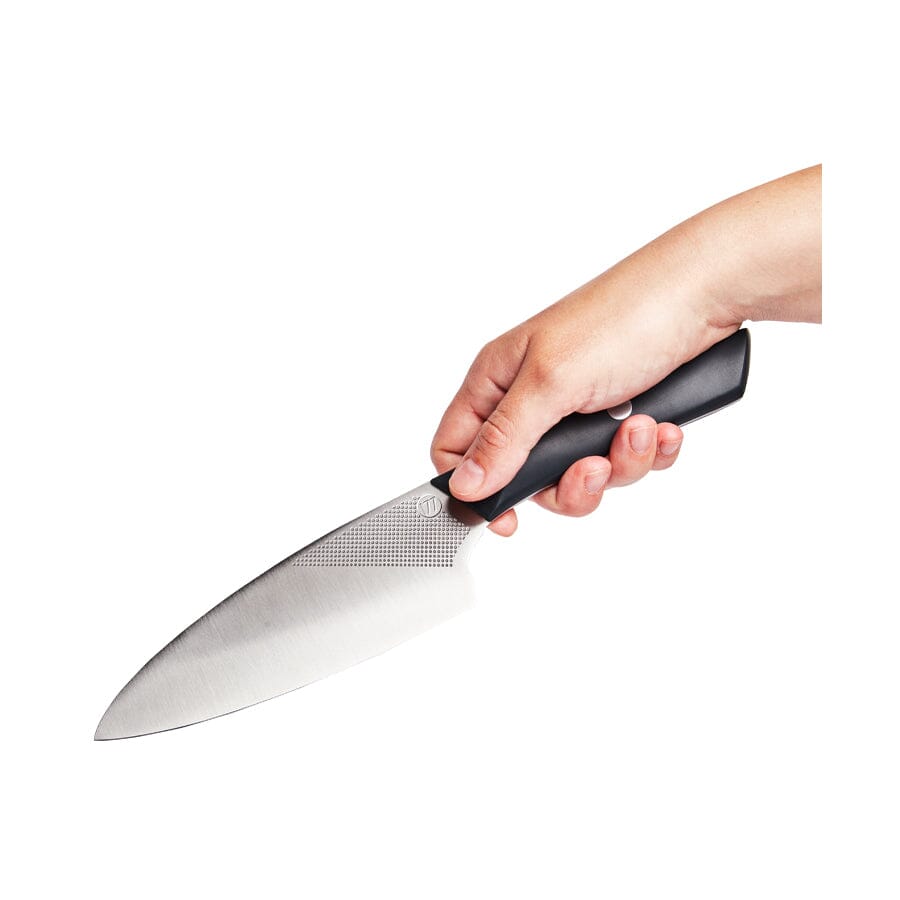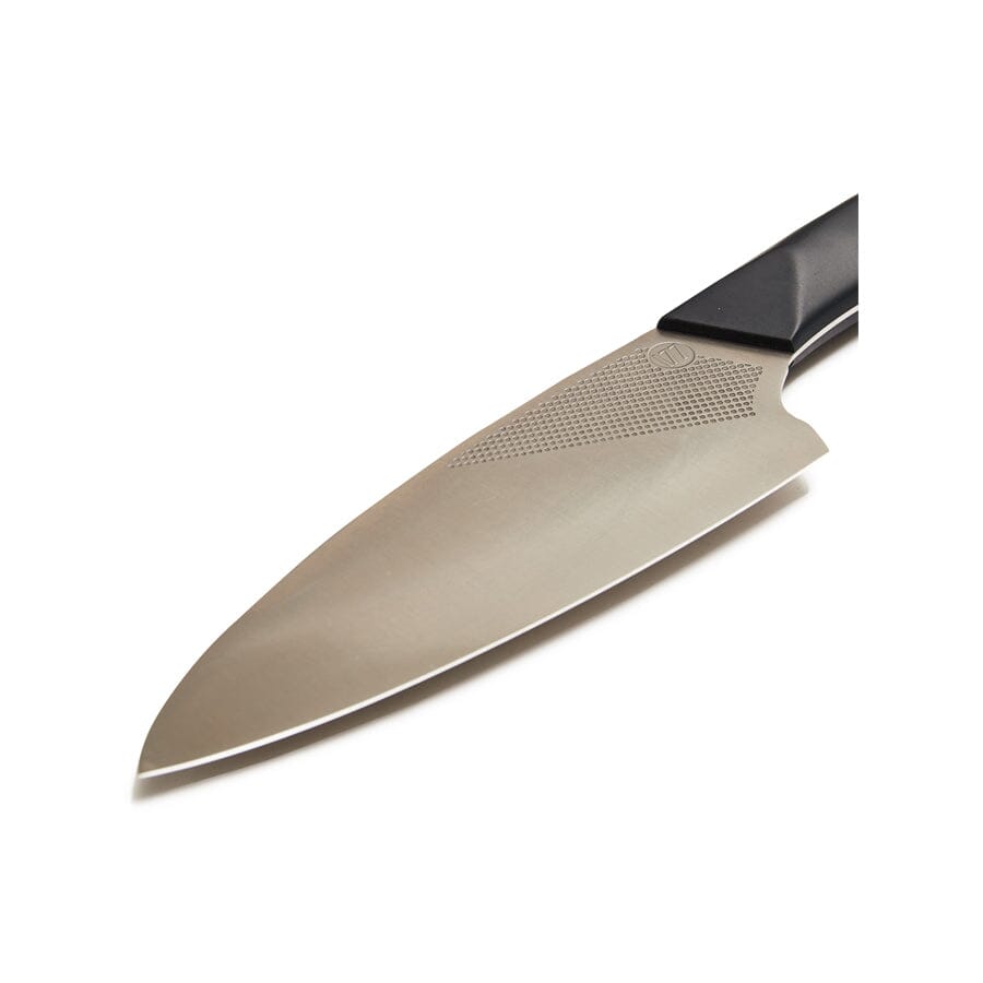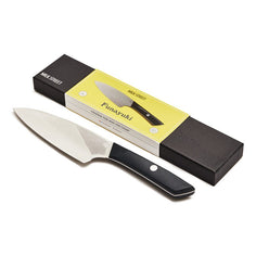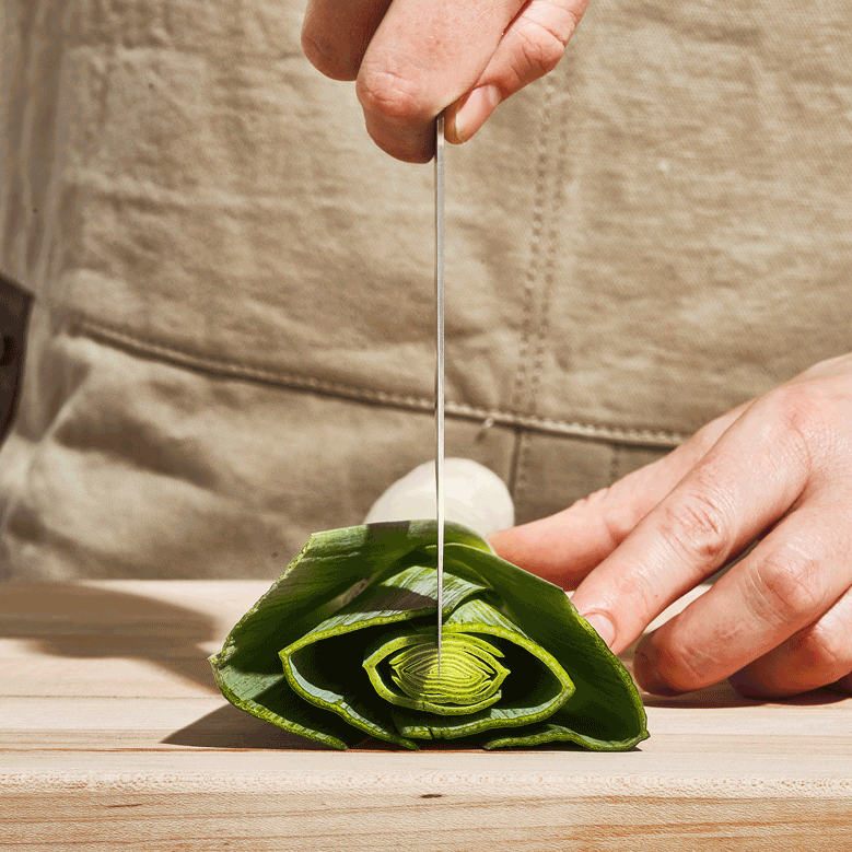 At Milk Street, we refer to this knife as the “power tool” of your knife block. The 6.5-inch-long, leaf-shaped blade is tall enough to safely chop through large amounts of ingredients at one time, yet it tapers quickly to a fine tip for precision tasks. The strongly arced blade and forward stance excels at cutting meats, though it minces and rock chops vegetables just as well. The curve extends the blade length for cleaner slicing in a compact package. Most of all, the stiff blade is shorter than a chef’s knife, which gives you more power and precision. With the Funayuki in hand, you can power through any food prep task in half the time.