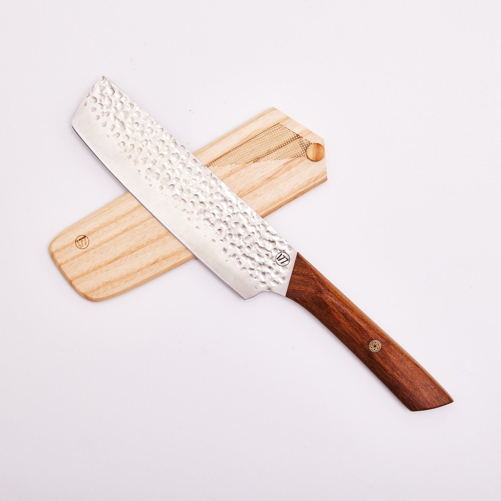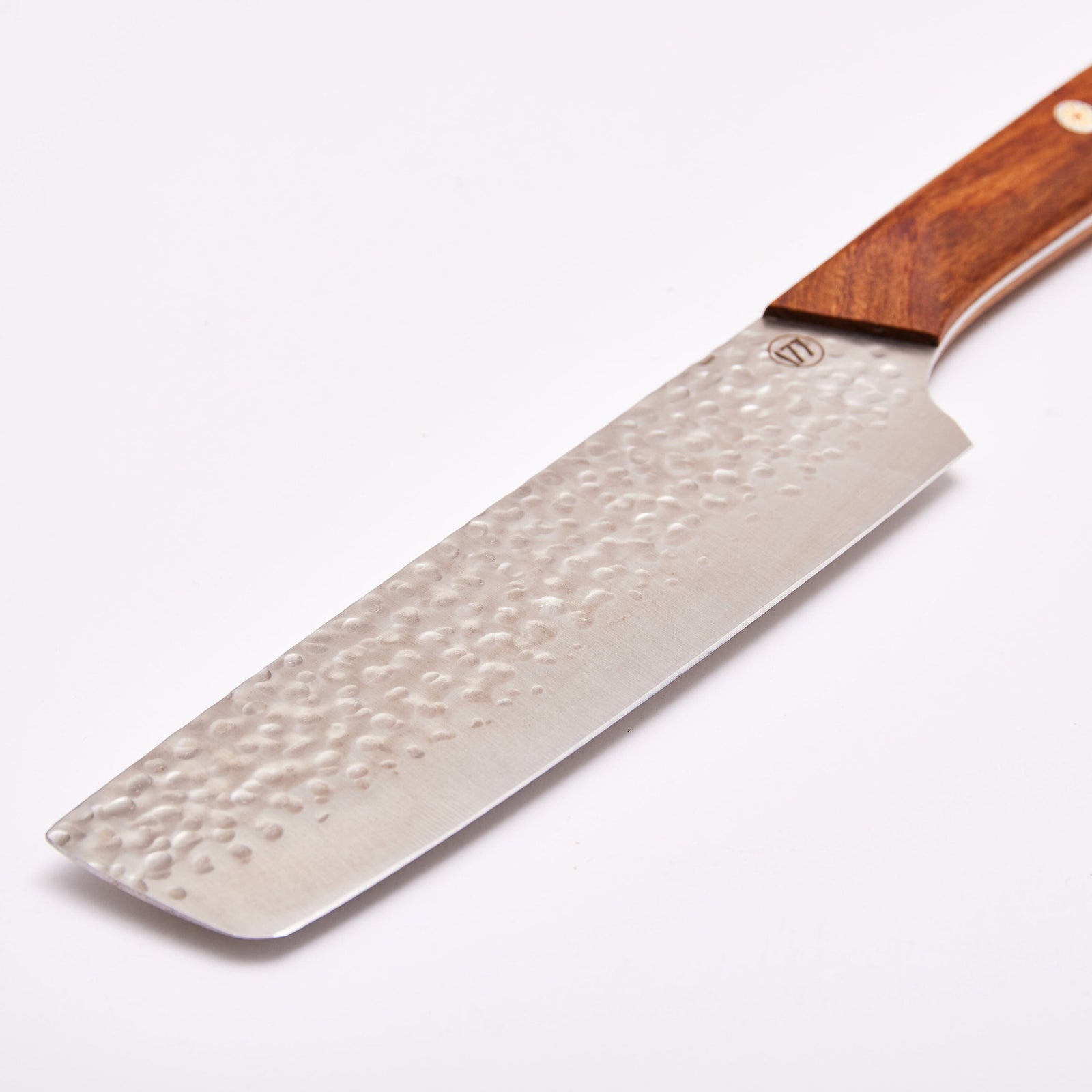 This is a limited edition, premium run of our tried-and-true Milk Street Nakiri knife. It features a high-end Japanese AUS8 steel blade specially treated with a nonstick “Tsuchime” hammered surface—foods slide right off—and a gorgeously grained cocobolo wood handle. And it comes with a custom saya, or knife guard, to keep your blade keen and protect it in storage. Consider it an heirloom-quality tool to pass on to the next generation.