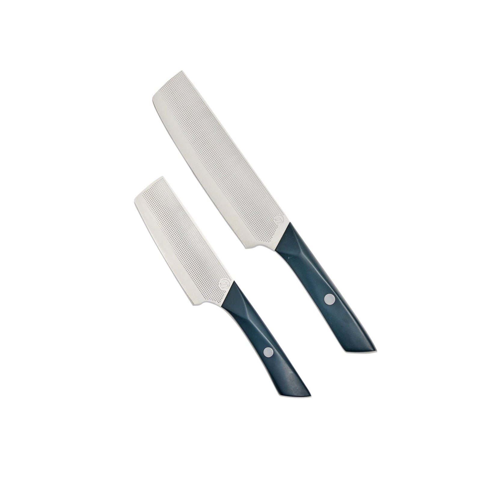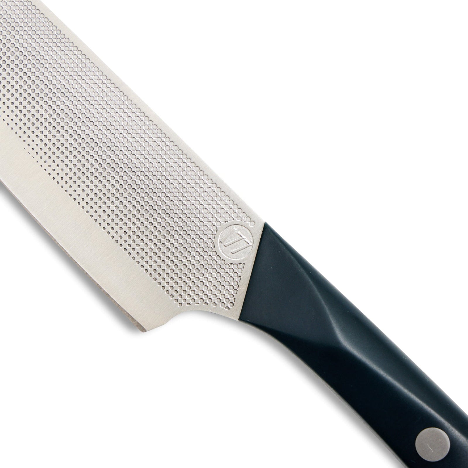 Like the larger Nakiri, the blade is embossed with a nonstick file pattern that replicates the kurouchi (blacksmith) finish to traditional nakiris, so sliced ingredients fall right off. A gentle curve at the butt accommodates fingers when choking up tight for control, and the handle has been designed to provide a nonslip grip.